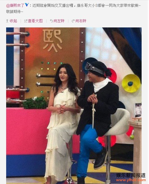 自小S怀孕之后就有说大S将会代班主持《康熙来了》,现在不久将来就可以看到大S录制的节目了,两姐妹花同主持《康熙来了》,谁更胜一筹呢,敬请期待!